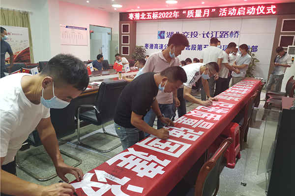 9月6日,枣潜北五标项目部在驻地会议室举行2022年“质量月”活动启动仪式,紧紧围绕“推动质量变革创新,促进质量强国建设”主题,集中宣贯2022年“质量月”活动方案及要求,开展横幅签名承诺和集体宣誓等,营造“人人重视质量、关注质量、提升质量”的良好氛围,牢固树立了质量第一的强烈意识。枣潜北项目部将以开展“质量月”活动为契机,全面提升项目质量管理水平,加强质量文化建设,抓好质量责任落实,确保项目建设高质量推进,圆满实现通车目标。